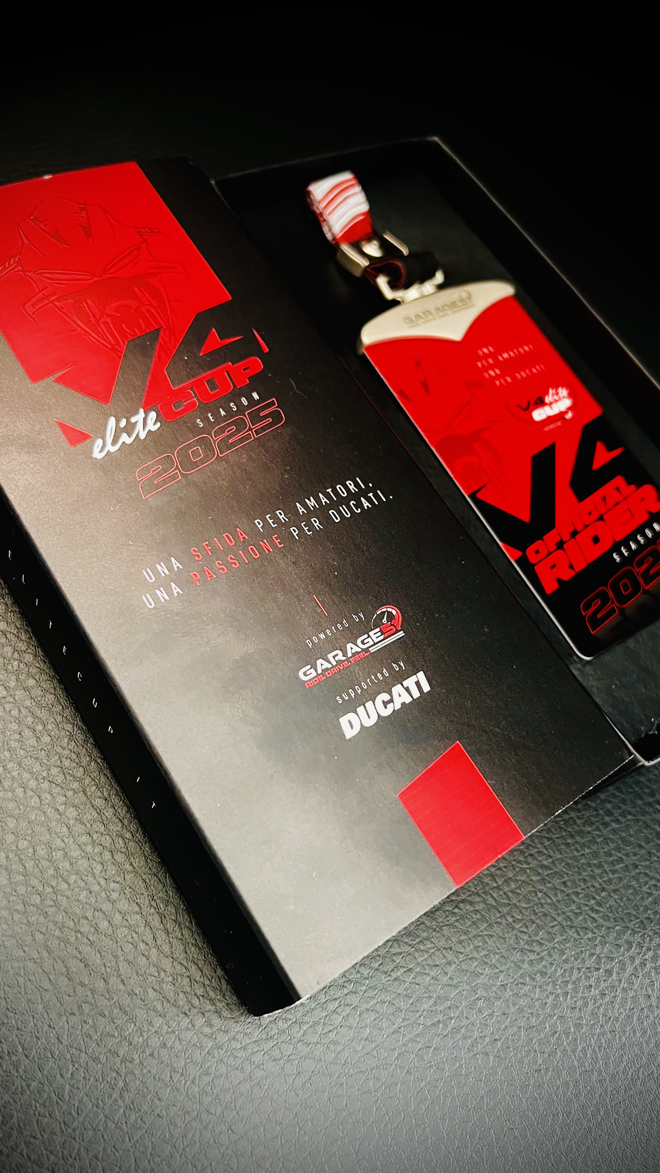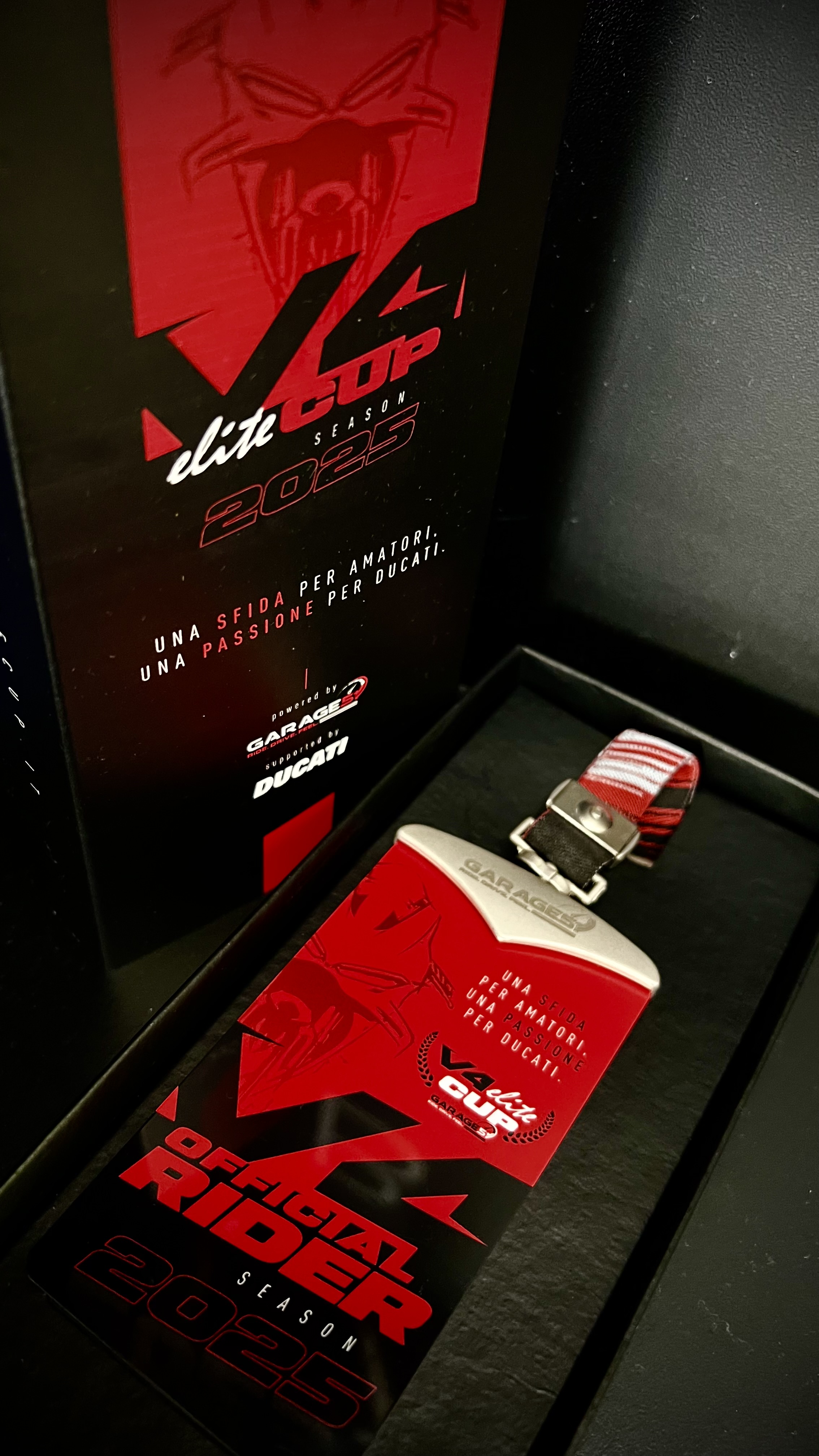 Il Pass V4 Elite Cup, elemento iconico ispirato allo stile MotoGP, realizzato con un design esclusivo è il simbolo di appartenenza ad una competizione unica nel suo genere, è il primo contatto con l'esperienza racing che ti aspetta in pista.